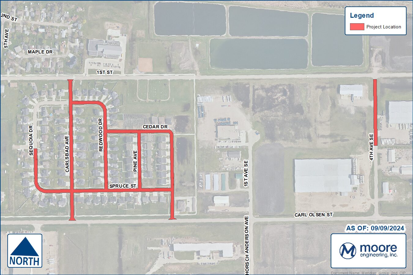The project scope consists of an asphalt mill and overlay of Meridian Grove 2nd addition streets, and the north section of 4th Ave SE where the pavement has been damaged.